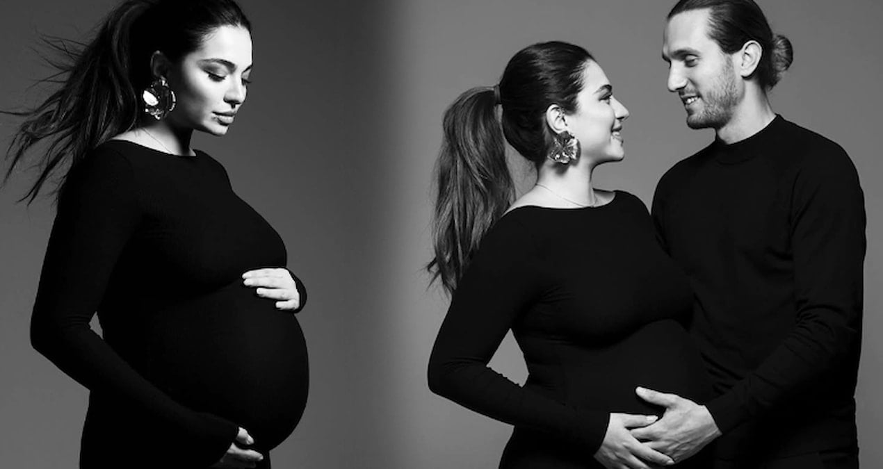 Ünlü oyuncu, eşi Yusuf Yazıcı ile kamera karşısına geçti. Çiftin, bebekleri doğmadan önce yaptırdıkları çekime beğeni yağdı.
